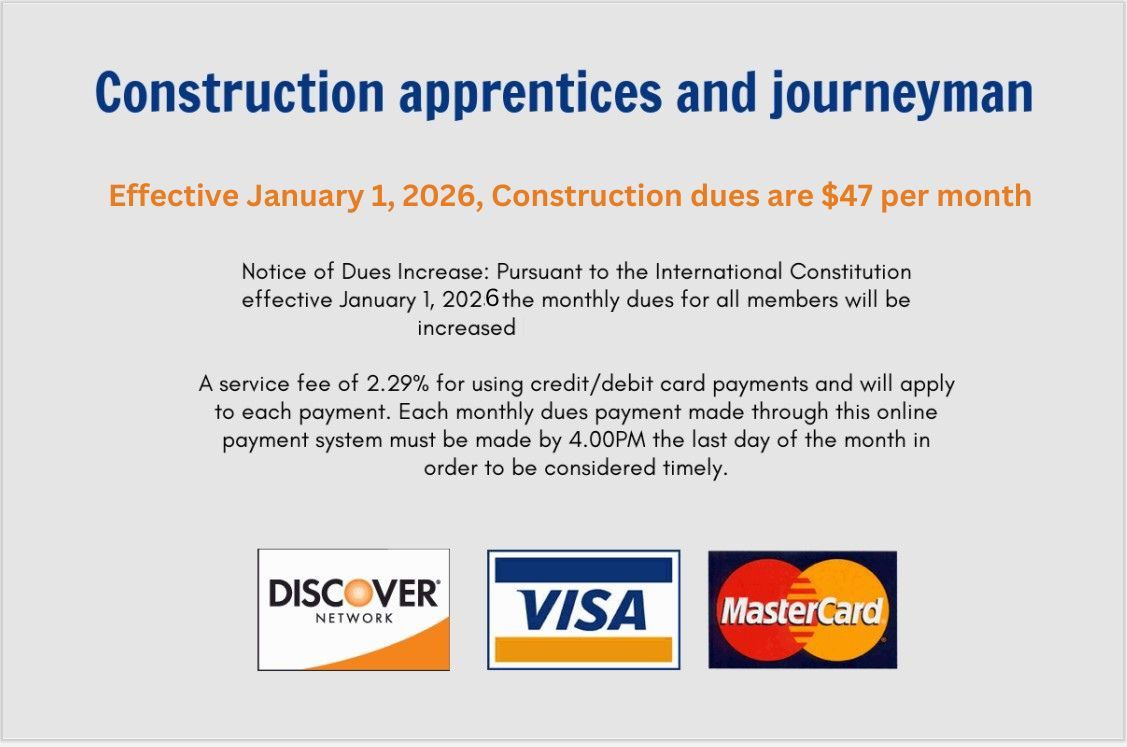 Please review your balances due tab above to find out your total dues owed. PLEASE NOTE: Journeymen and Apprentices monthly dues rate is currently $47.00 per Month. You can click the calculator next to monthly dues below to populate your total based on how many months you wish to pay.