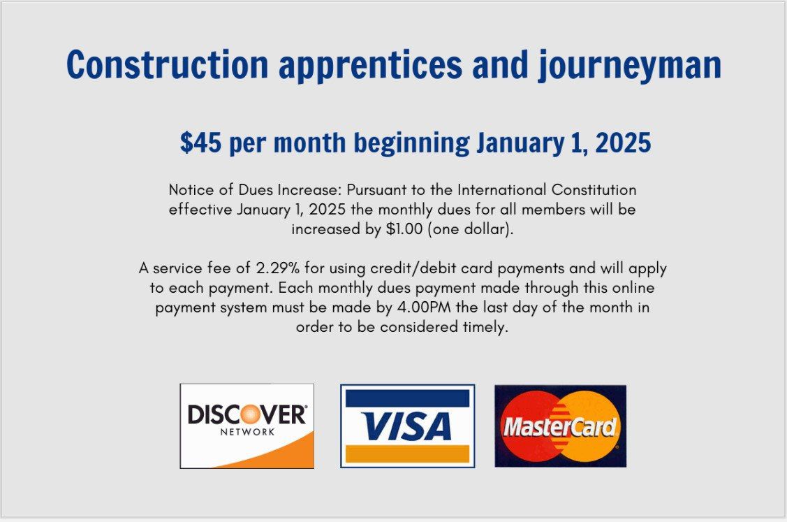 Please review your balances due tab above to find out your total dues owed. PLEASE NOTE: Journeymen and Apprentices monthly dues rate is currently $45.00 per Month. You can click the calculator next to monthly dues below to populate your total based on how many months you wish to pay.